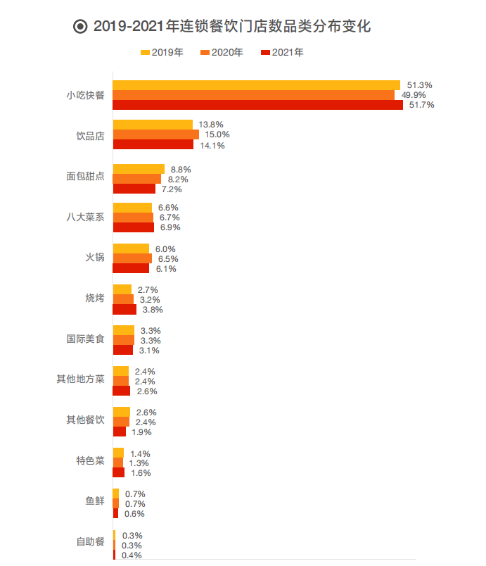 作為性價比較高的小吃小喝正在逐漸成為流行趨勢。根據白皮書顯示,在2021年連鎖門店品類分布中,小吃快餐門店的占比達到了51.7%位居第一,第二名的茶飲門店占比超過14%。