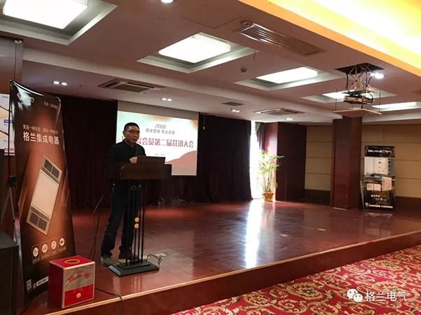 隨后,格蘭電氣營銷總經理胡總上臺發言致辭。胡總回顧了格蘭電氣公司二十余年的發展史,介紹了各類產品系列、新品、營銷規劃等方面。此外,胡總也分析了電工電氣行業的大環境和市場的現狀,面臨原材料價格的飛速上漲,各項成本的大幅上升,公司也壓力倍增,市場銷售的任務愈加艱巨,面對這些市場壓力,胡總就公司2018年的營銷規劃和市場戰略調整也做了簡短的描述和傳遞,受到大家的一致認可,同時胡總也表示,大家應該團結一心,共同努力,加強客戶的管理,提高市場的洞察和創新能力,為各個經銷商提供更寬廣的平臺,從而促進各合作伙伴的新一輪的快速增長。